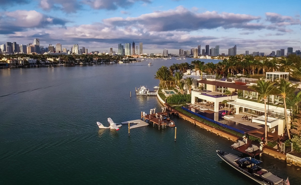 清爽的白色户外躺椅整齐地排列在阳光露台周围,高耸的棕榈树直抵湛蓝的天空。一个无边泳池反射着蔚蓝的天空,环绕着户外生活空间的锐利边缘。两个停泊码头从房子伸出来迎接摩托艇和小船,保持陆地和海洋之间的流动连续和流畅。露台的尽头还有一个户外酒吧,一排凳子站着准备好陪伴。马提尼酒座椅已安装在浅水区,户外弹出式餐桌在水边等待供应晚餐。