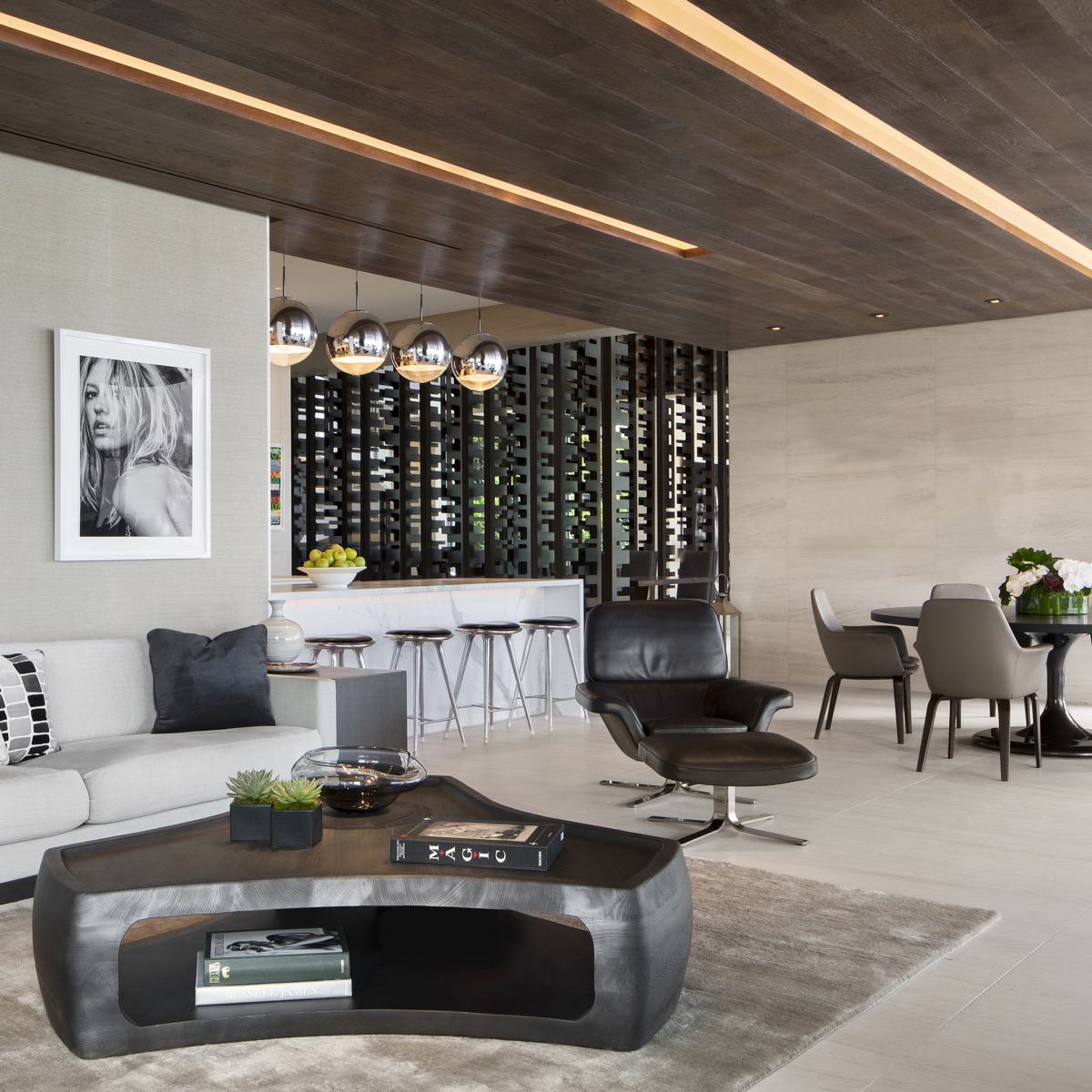 木质天花板上的切割条显示 LED 光源。房间的中心是一张独特的咖啡桌,下面有储物空间,放在银灰色的地毯上。在休息室和厨房餐厅之间的连接空间里,有一把黑色的椅子和配套的脚凳,同样的单色调色板一直延续到那里。令人惊叹的切割青铜面板从另一侧的房屋主要内部核心屏蔽厨房。