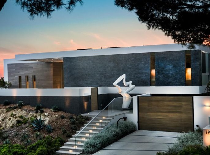 客人走上这座山顶住宅的前台阶,会看到理查德·埃德曼 (Richard Erdman) 的卡拉拉大理..