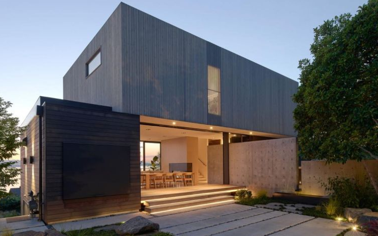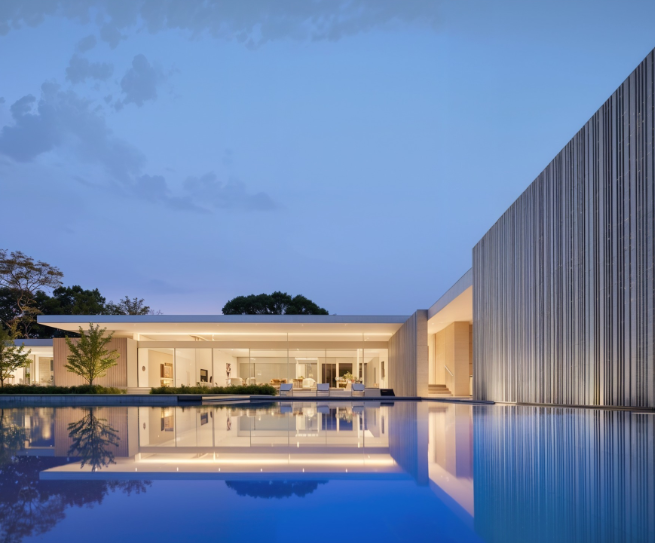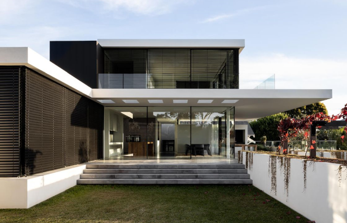一座结构紧凑、组织严密的住宅,其线条简洁优雅,采用基本的几何形状和单色,对周围环..